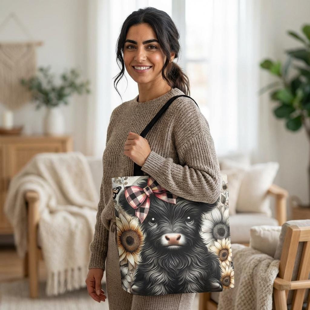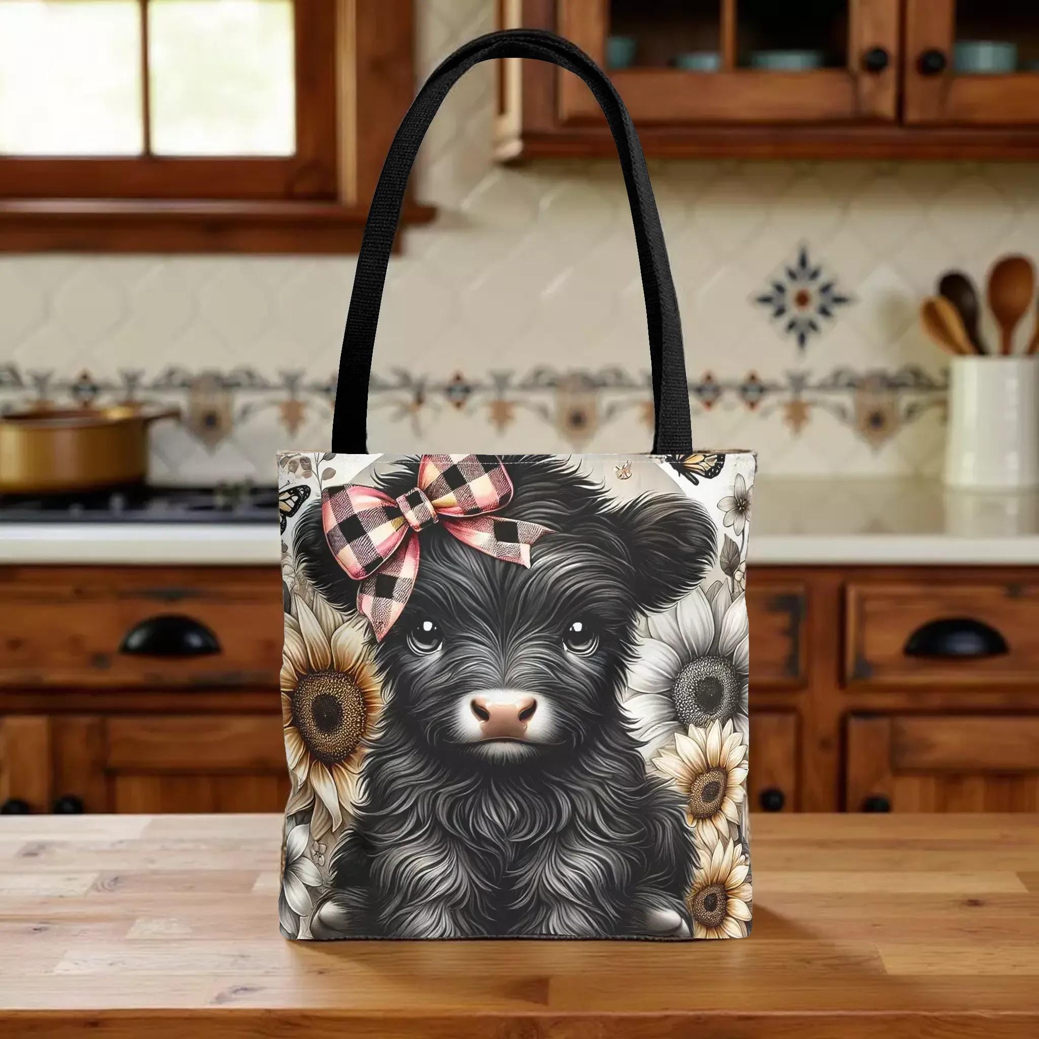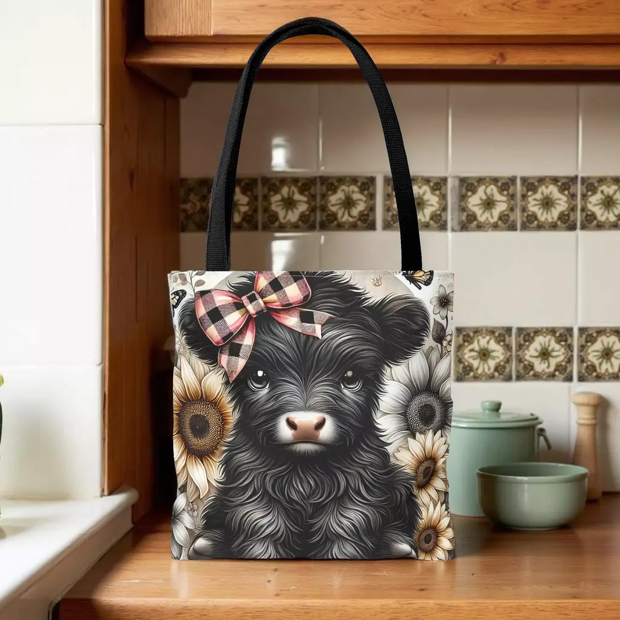 Embrace a touch of countryside whimsy with this charming Highland calf tote, perfect for those who adore farmhouse style and practical accessories. Featuring a delightful illustration of a cute cow adorned with a plaid bow and sunflower accents, this shopping carryall blends playful design with everyday functionality. Lightweight yet sturdy, it’s ideal for carrying groceries, books, or market finds while adding a cozy, rustic vibe to your day.