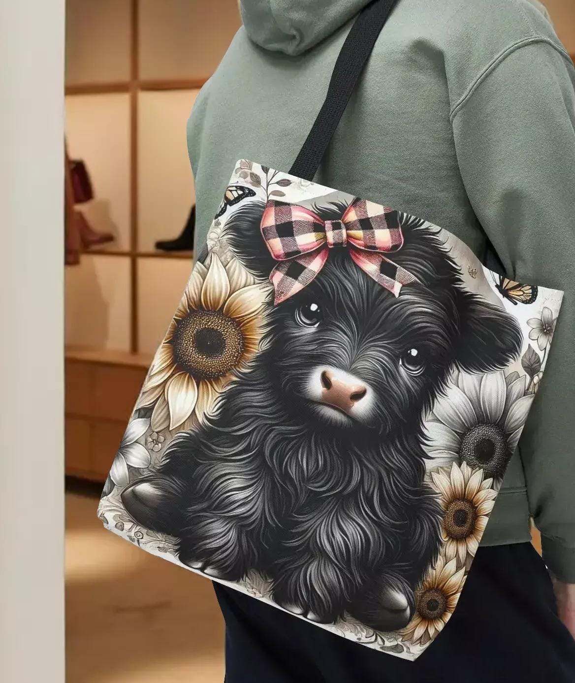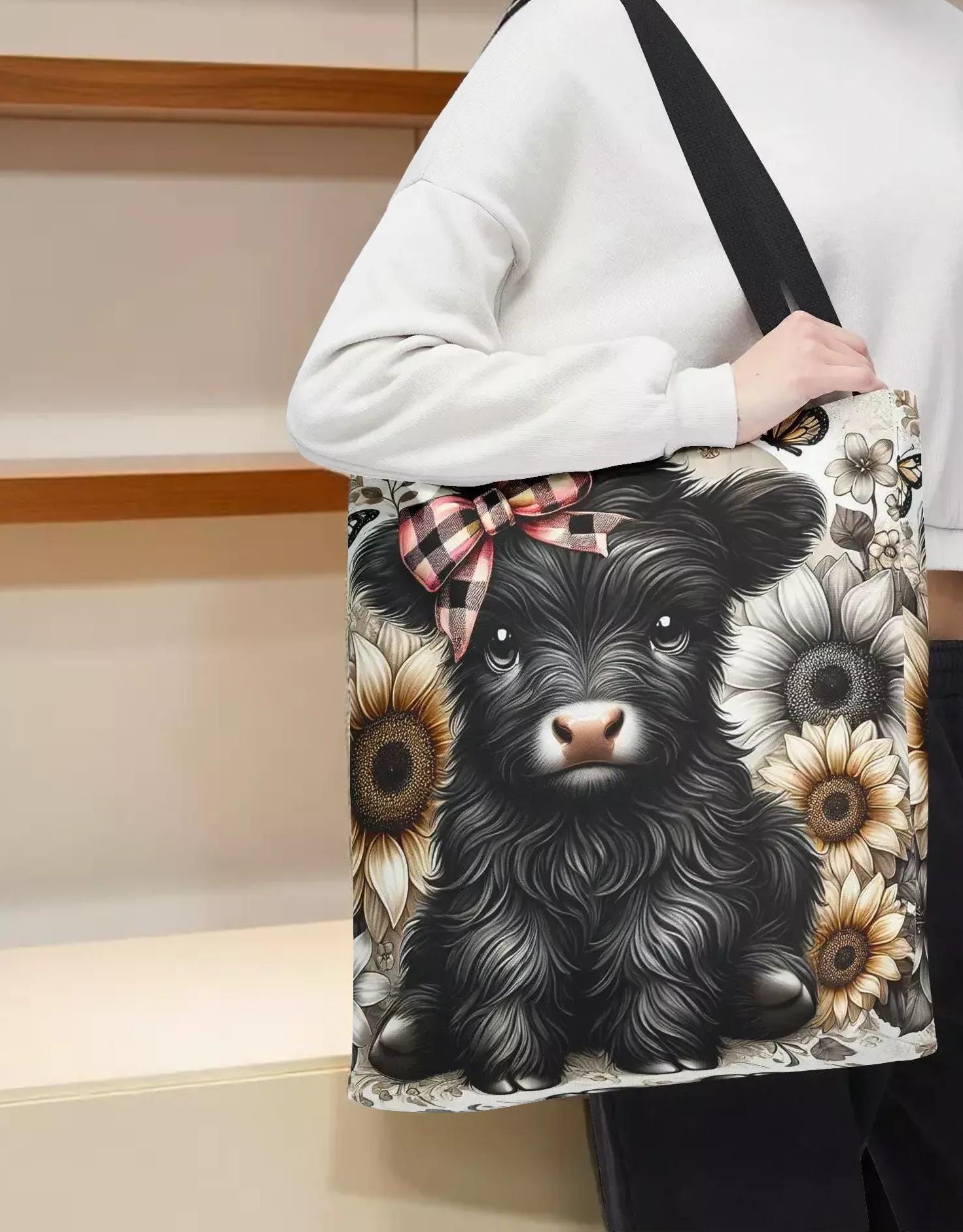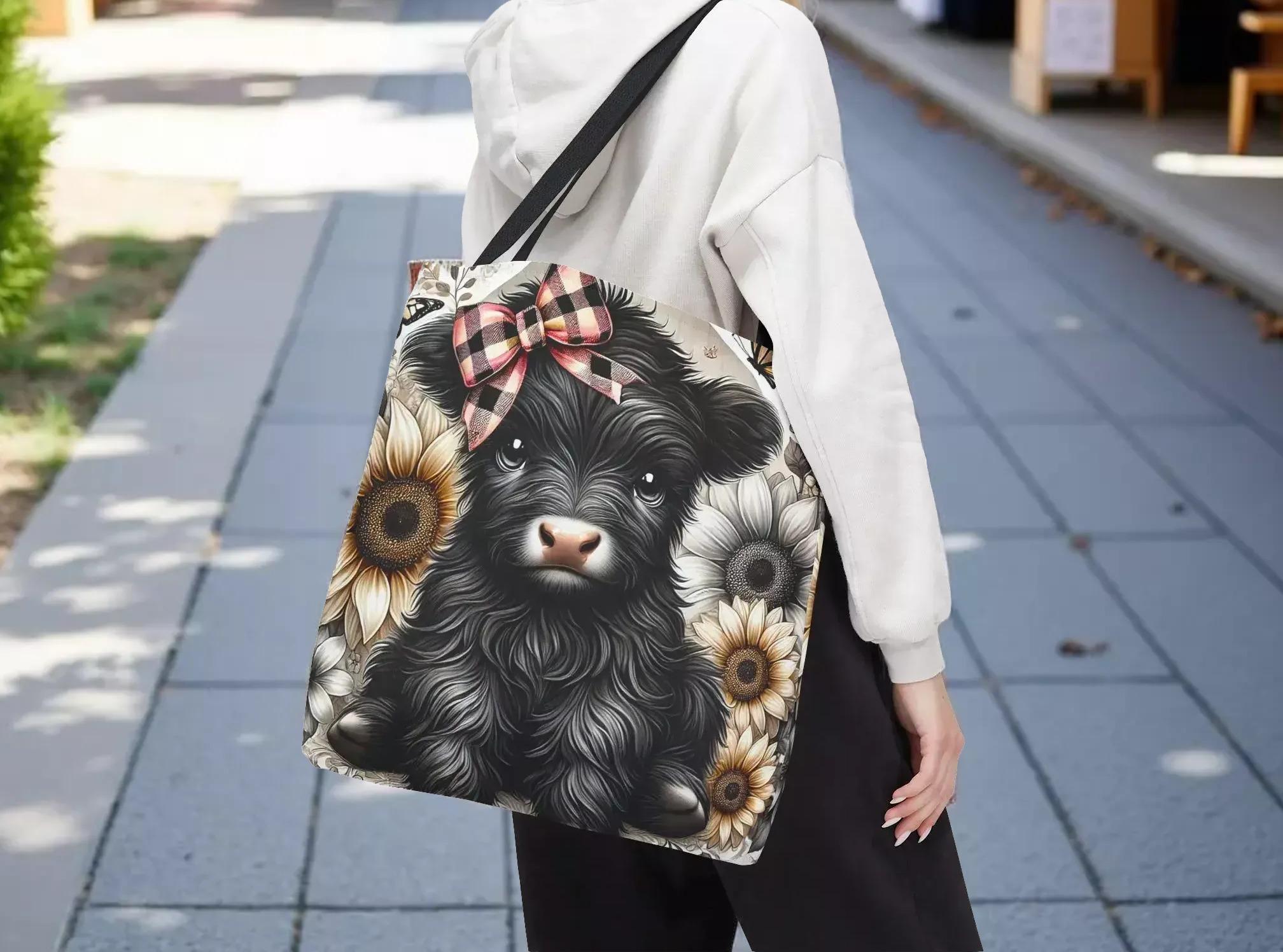 Embrace a touch of countryside whimsy with this charming Highland calf tote, perfect for those who adore farmhouse style and practical accessories. Featuring a delightful illustration of a cute cow adorned with a plaid bow and sunflower accents, this shopping carryall blends playful design with everyday functionality. Lightweight yet sturdy, it’s ideal for carrying groceries, books, or market finds while adding a cozy, rustic vibe to your day.