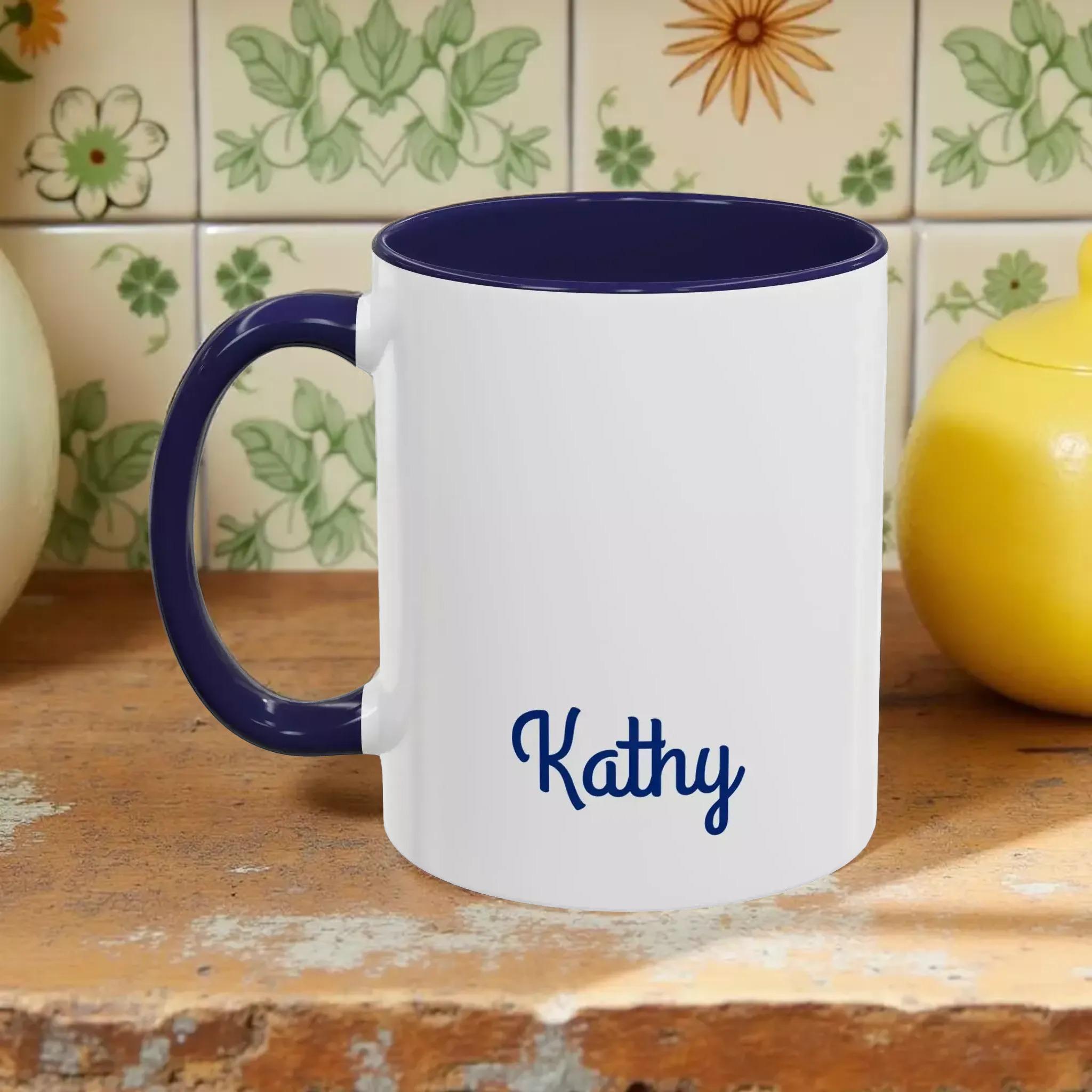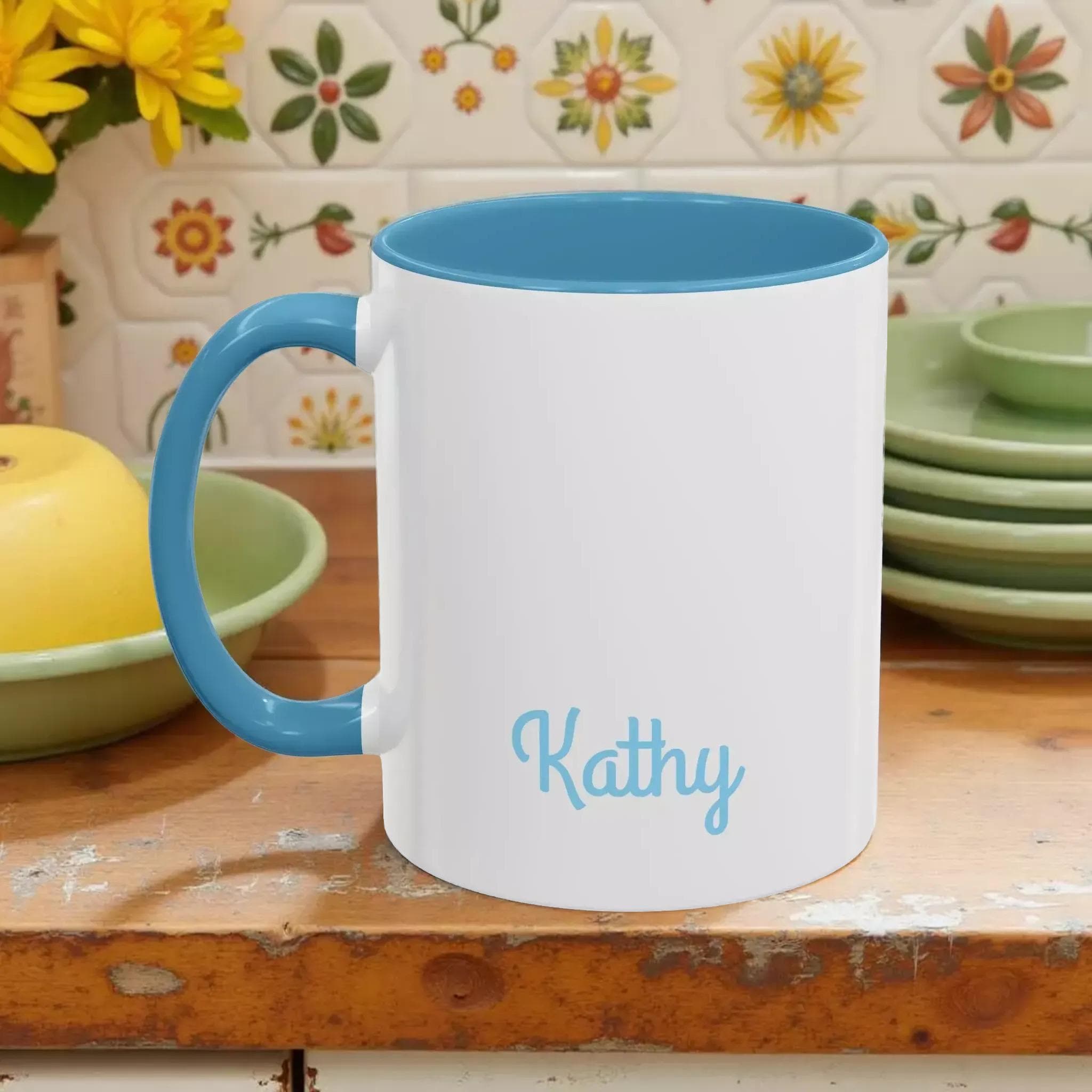 - White ceramic with contrasting colored interior and handle