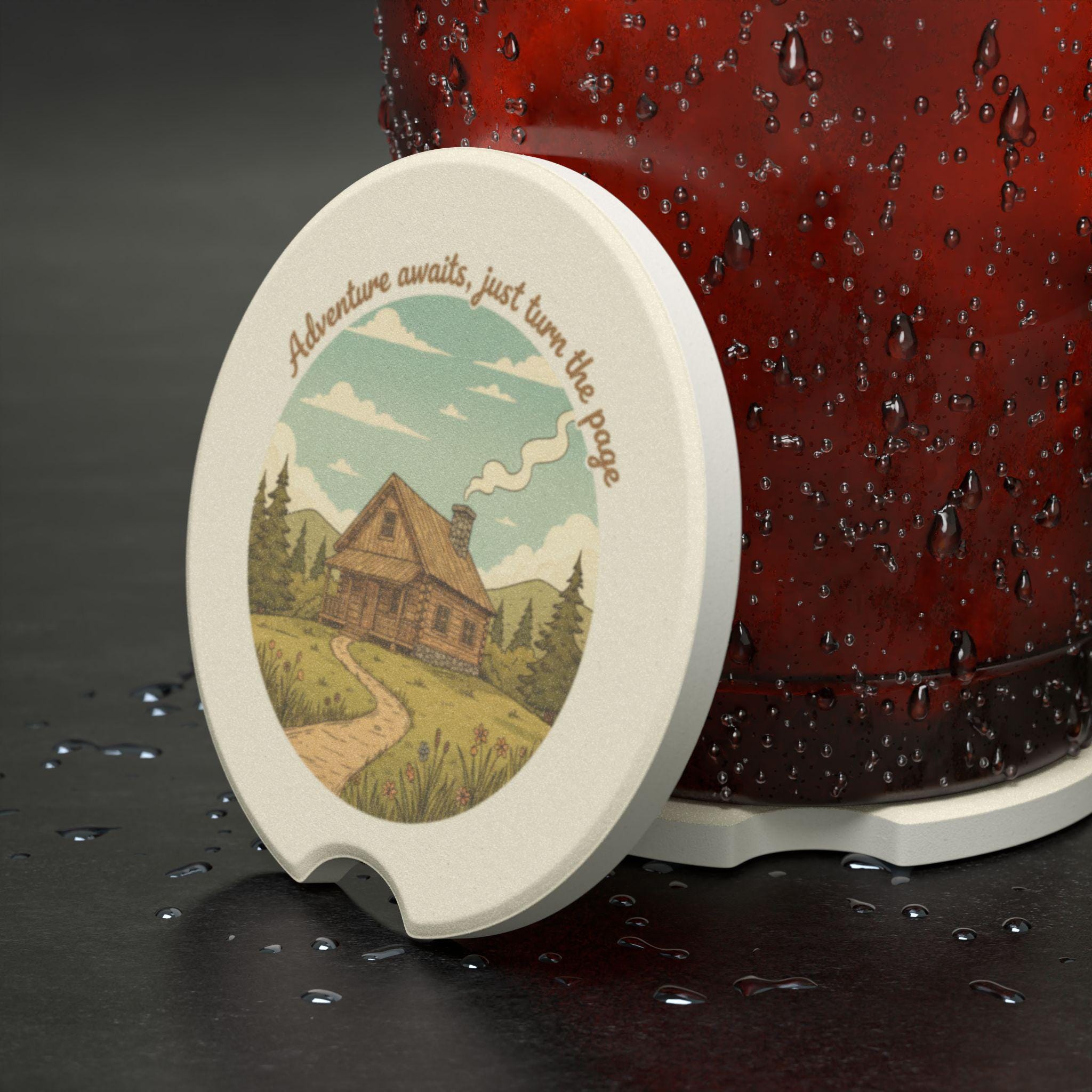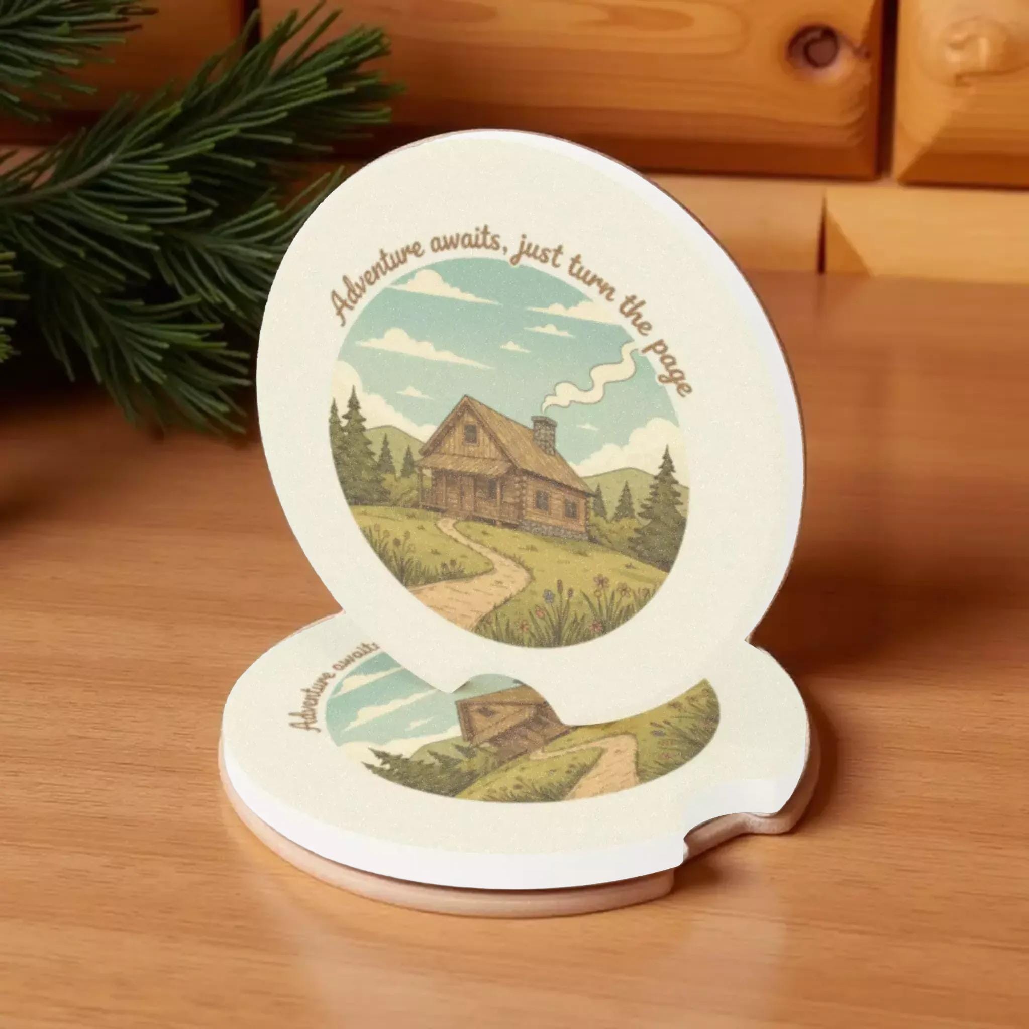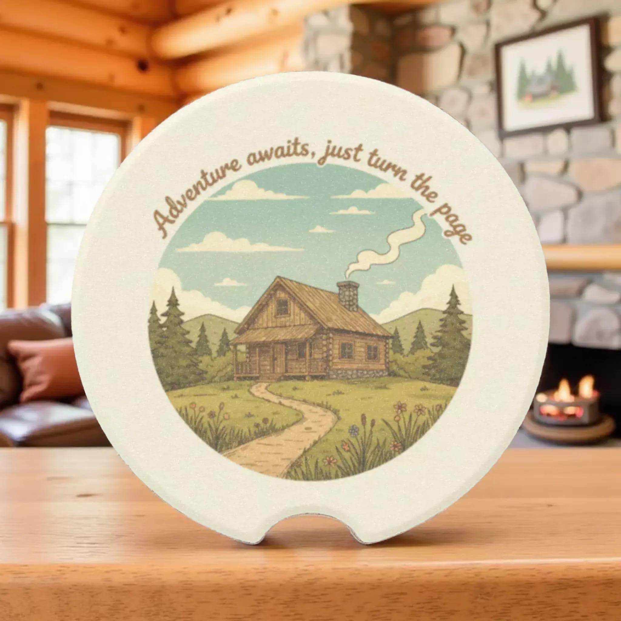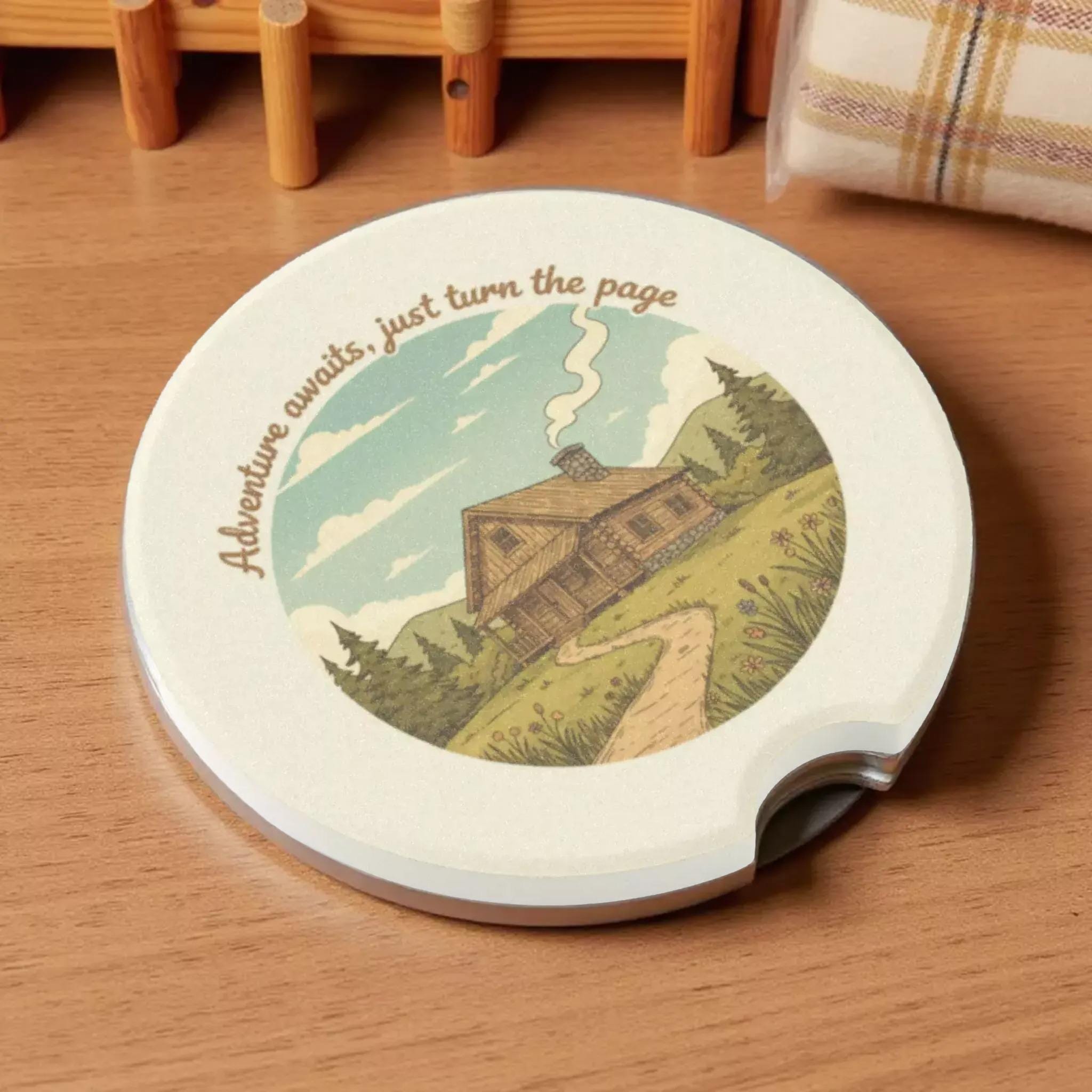 Infuse your daily drive with a touch of quiet wanderlust using this charming car coaster, perfect for anyone enchanted by cabins, adventure, and cozy moments. Featuring a warm, vintage cabin design with the inspiring phrase “Adventure awaits, just turn the page,” this ceramic coaster brings a peaceful woodsy scene to your vehicle’s cup holder. Crafted to absorb condensation, it keeps your car dry while inspiring daydreams of forest trails and tranquil mornings.