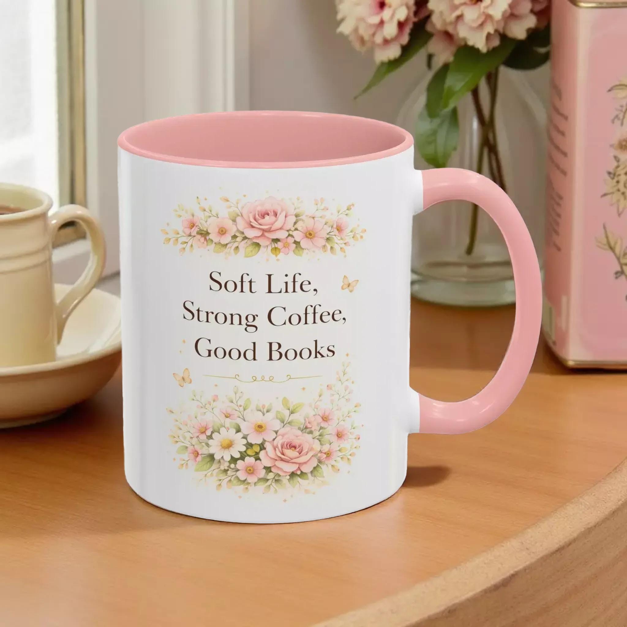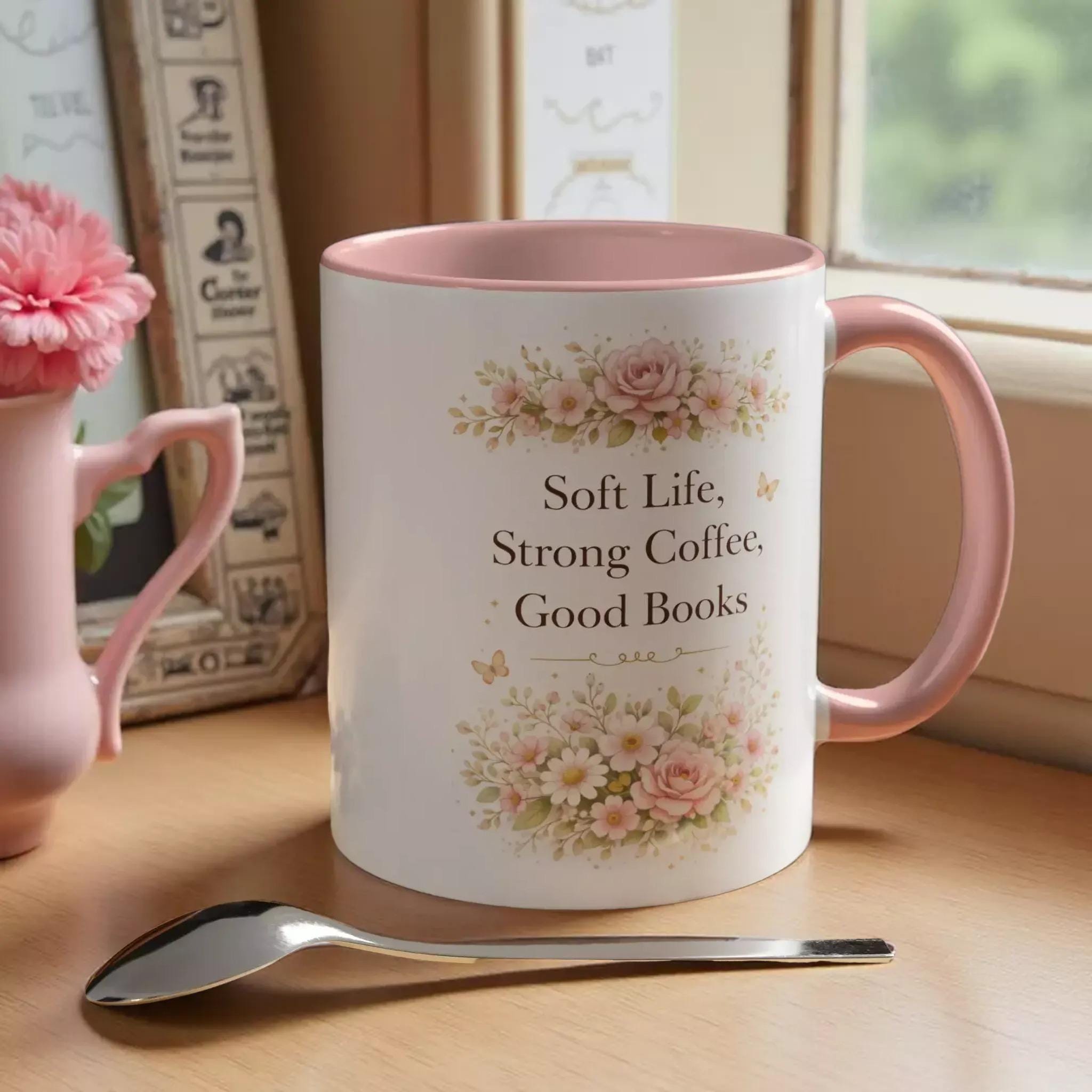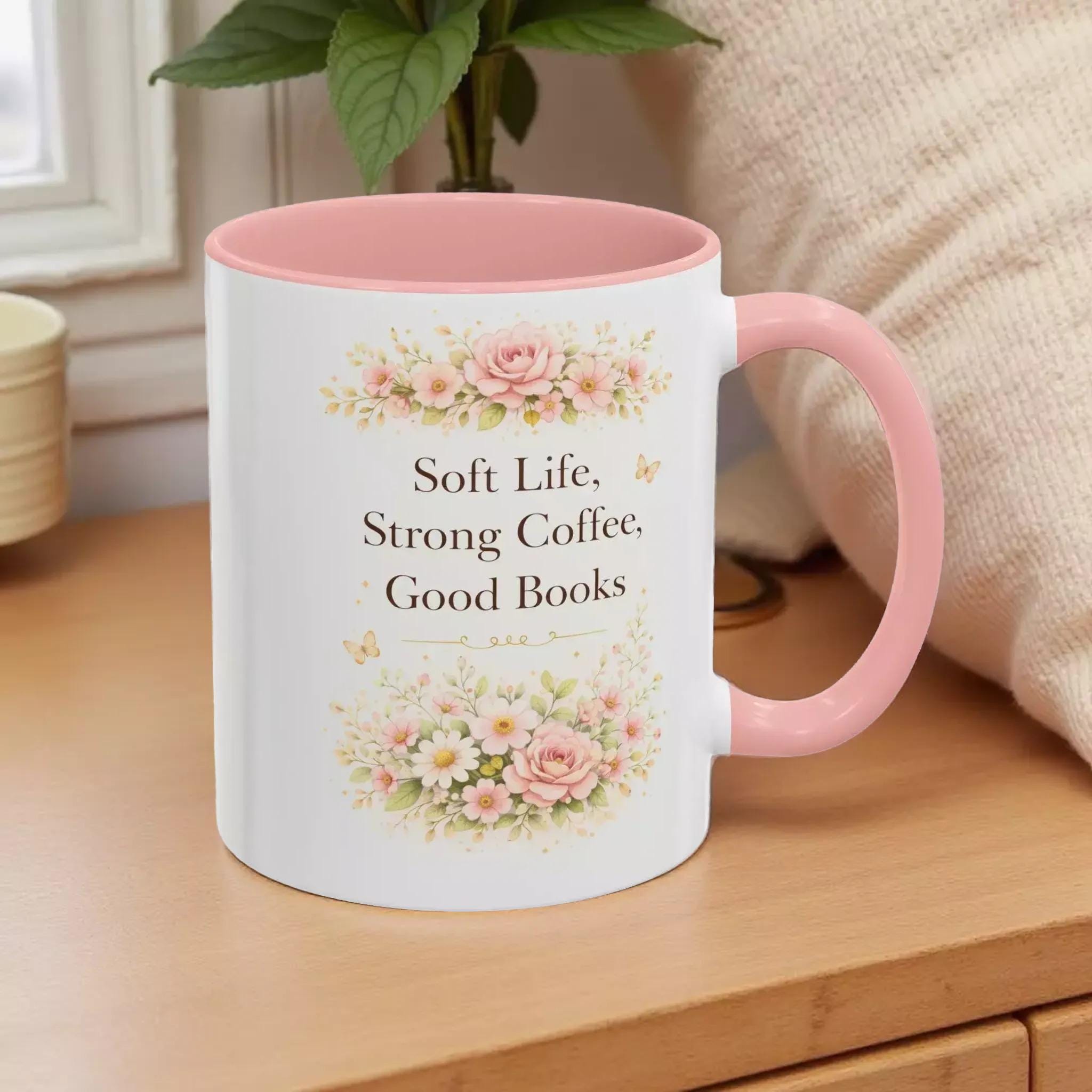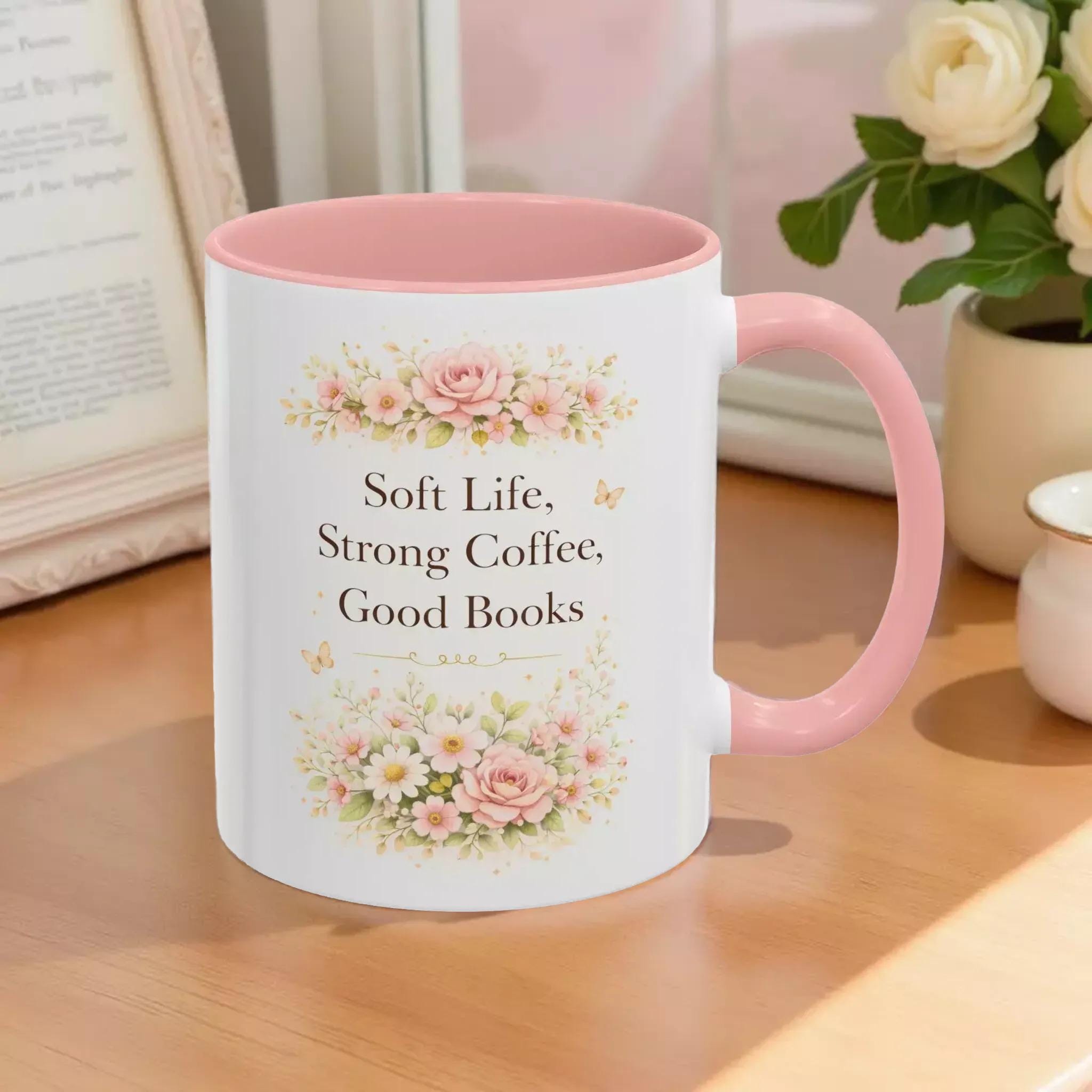 - Features bright floral artwork with the inspiring phrase “Soft Life, Strong Coffee, Good Books” framed by butterflies