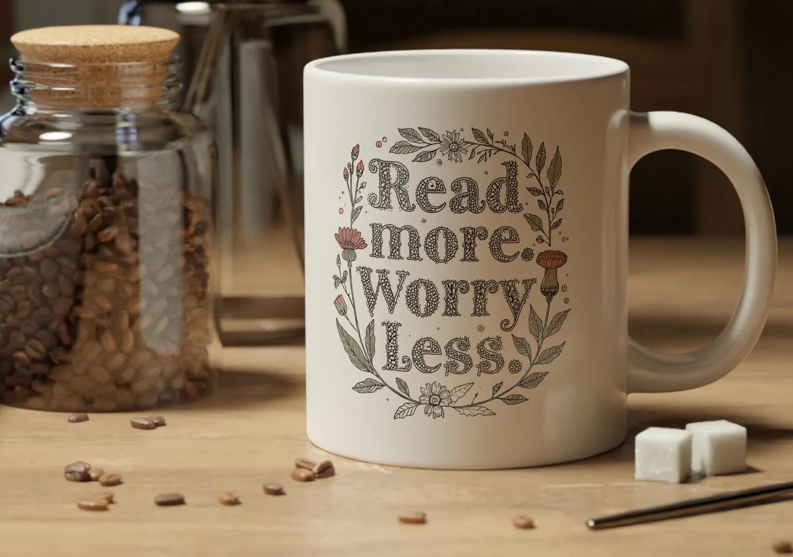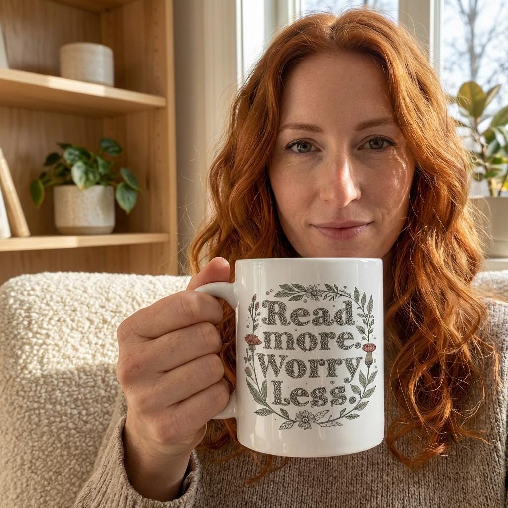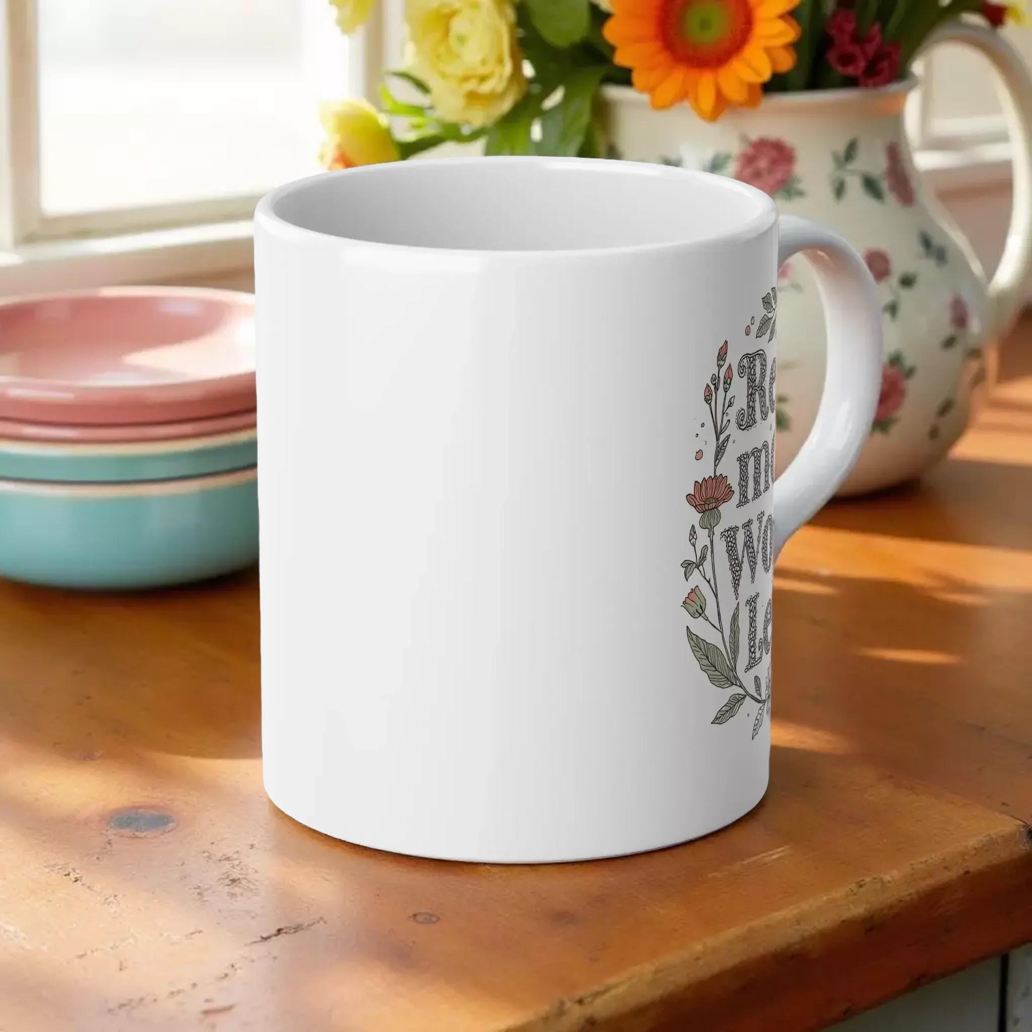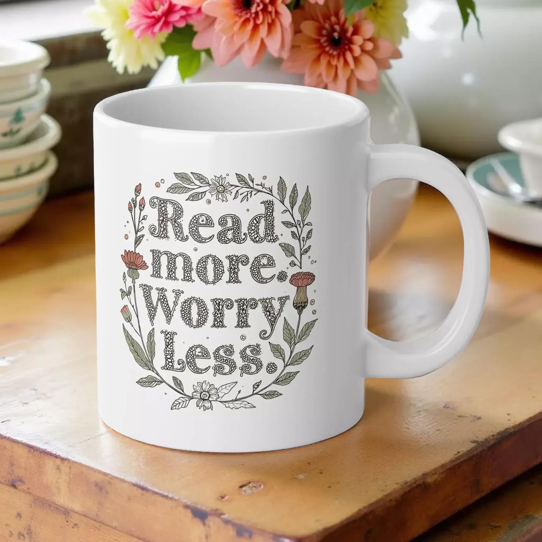 Start your day with a moment of calm and inspiration using this beautifully crafted 20oz jumbo mug. Featuring delicate botanical illustrations and warm, earthy lettering, this floral ceramic coffee cup invites you to read more and worry less as you savor each sip. Designed for those who cherish slow mornings and long afternoons, it blends artistry with practicality in a way that feels both personal and timeless.