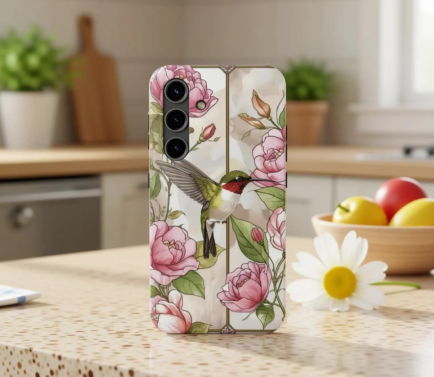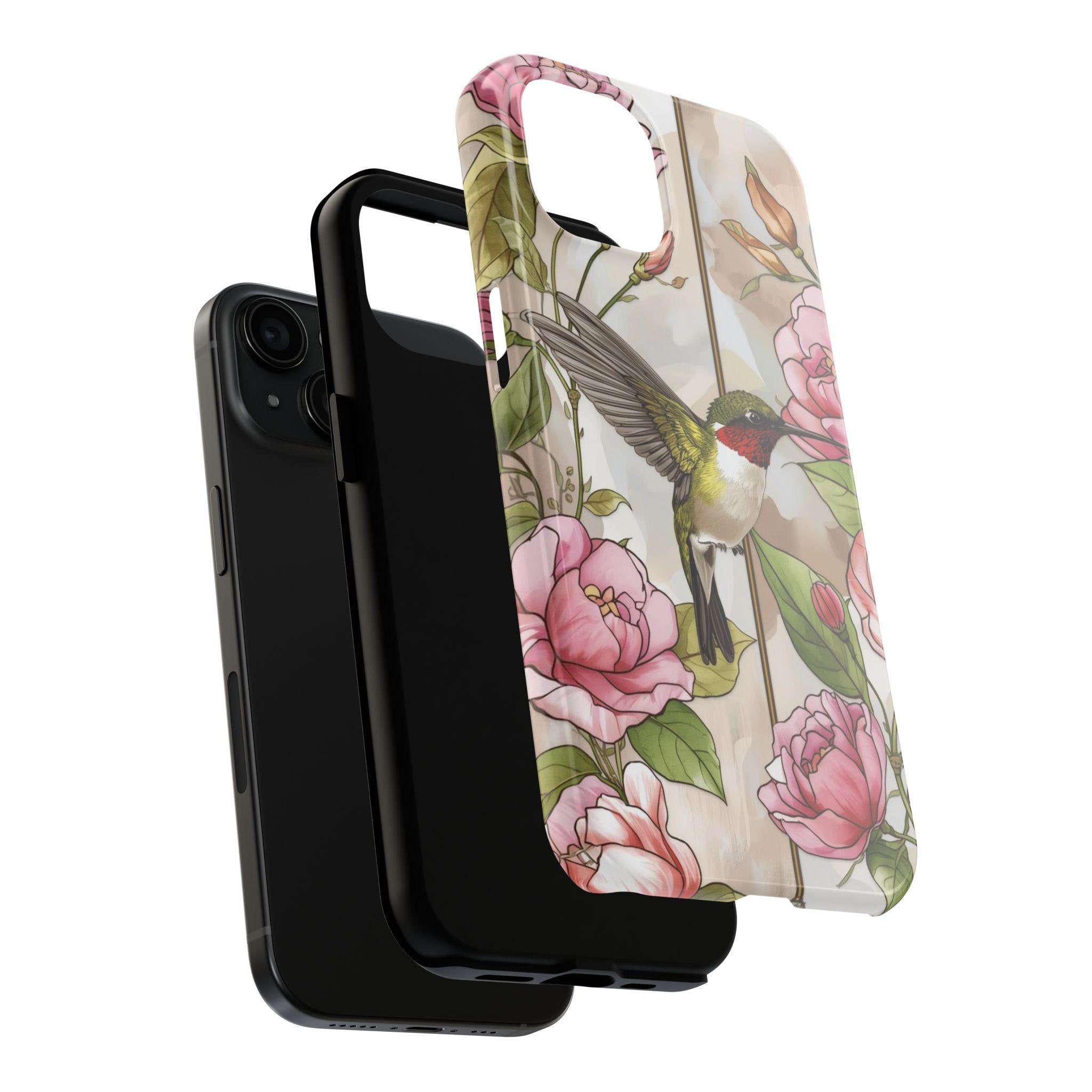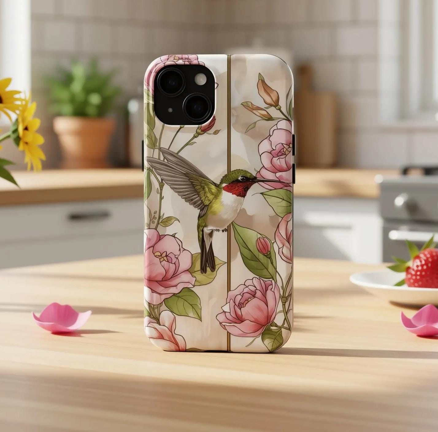 Step into a pocket-sized garden where delicate pink peonies bloom alongside a vibrant hummingbird, captured in crisp, glossy color. This floral protective cover combines beauty and function, designed to shield your phone with style. Crafted for those who appreciate nature-inspired art and durable design, this tough phone case offers lightweight protection without compromising on elegance.