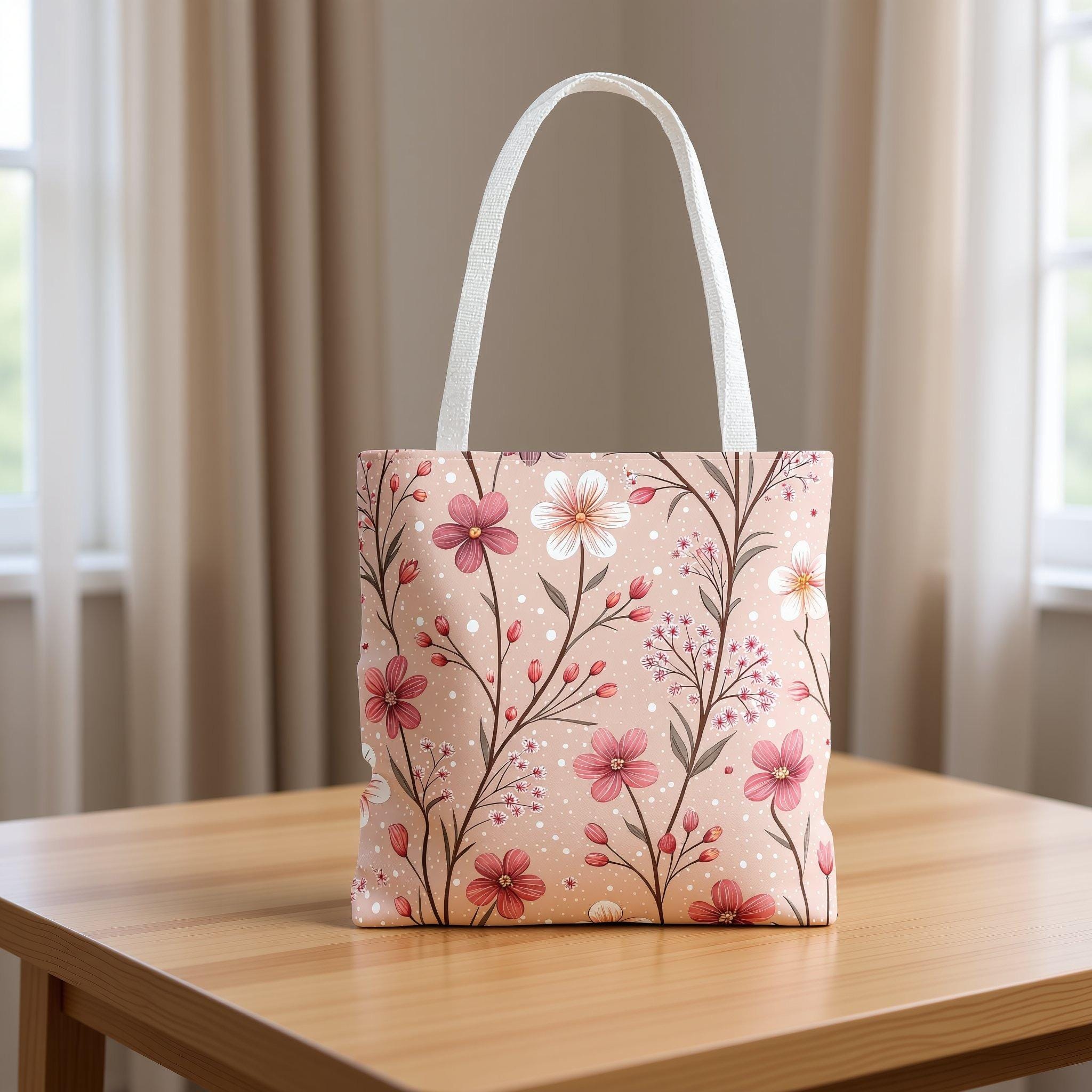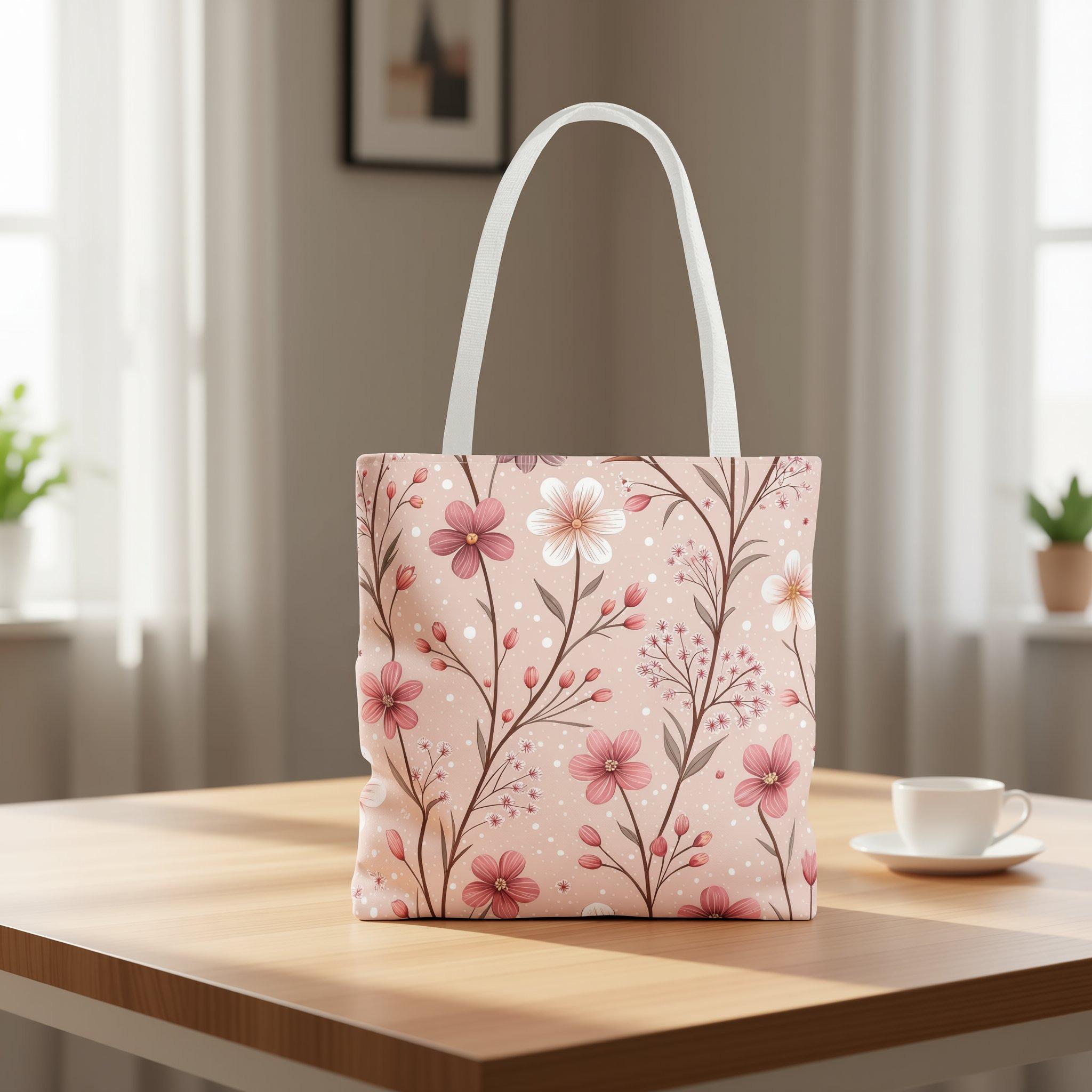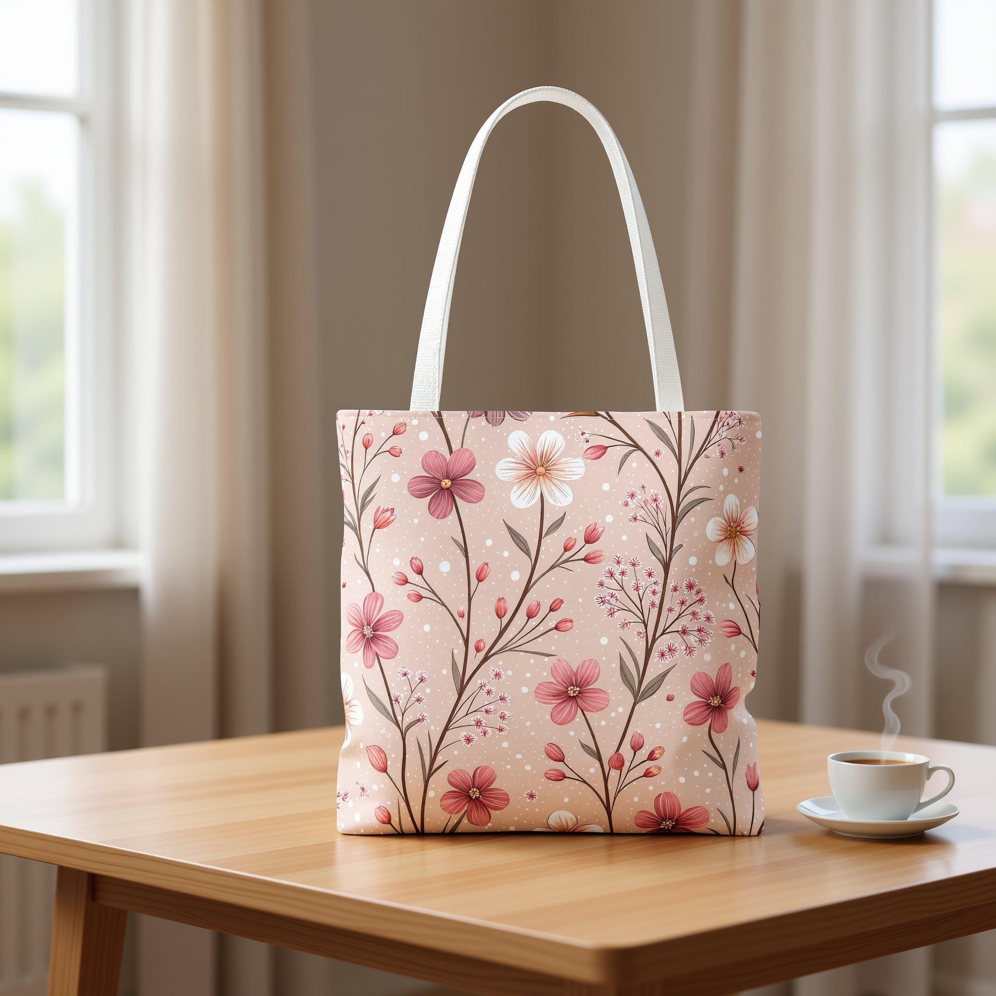 Step into a world of gentle elegance with this floral pink blossom tote bag, where soft, dusty-rose blooms create a serene, cottage-garden vibe perfect for daily adventures. Whether you're heading to the farmers market, enjoying a slow afternoon at the park, or simply need a stylish catchall at home, this tote combines beauty and practicality seamlessly. Its lightweight polyester fabric and laminated interior ensure durability and moisture resistance, making it an ideal companion for errands and leisure alike.