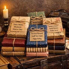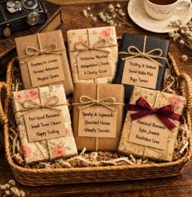Not for this listing—it’s all about the mystery! But each book comes with a tag describing the vibe (e.g., “Enemies to Lovers,” “Space Opera,” “Haunted House”).