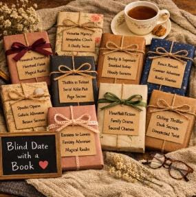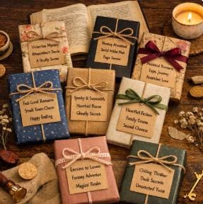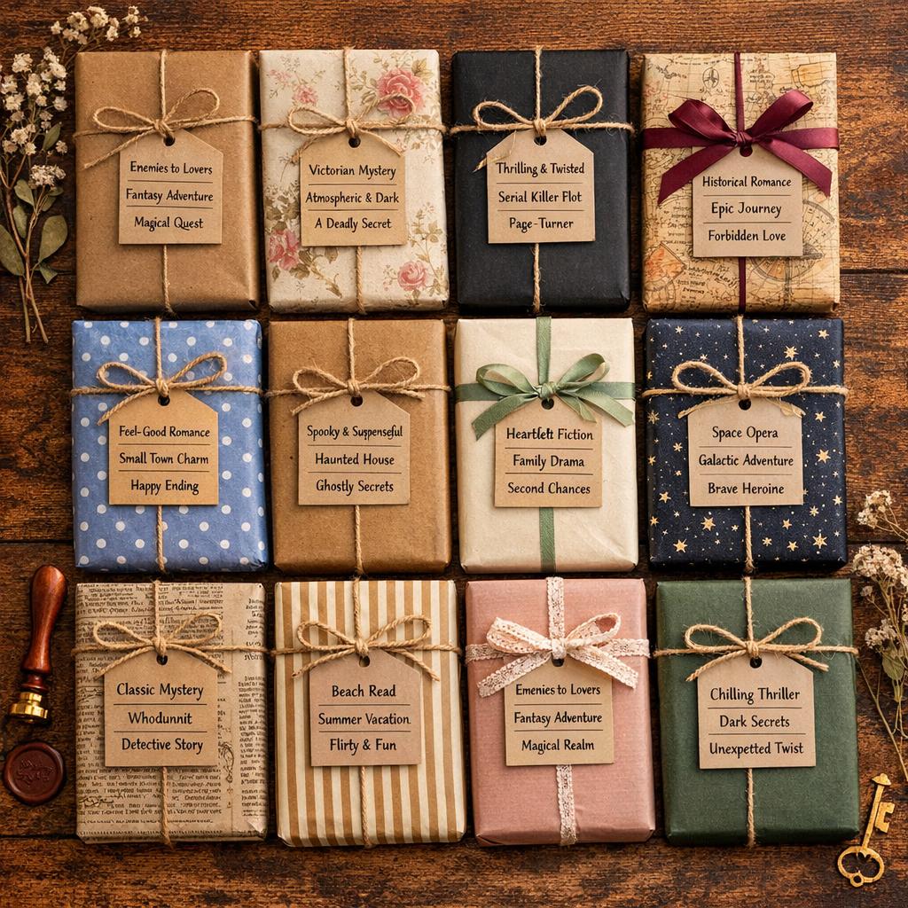 Our Book A Month Club is a cozy, curated experience for readers who love surprises. Choose a set of 3, 6, 9, or 12 blind date books, each wrapped with care and tagged with hints about the story inside. No titles. No covers. Just vibes.